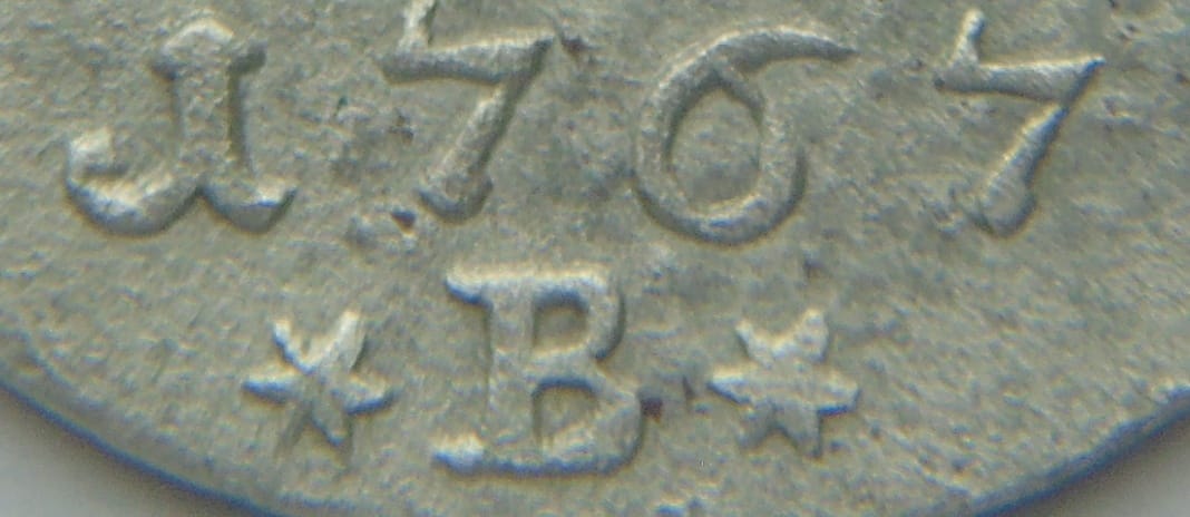 | 1 | FRIDERICUS BORUSSORUM REX | (czteropłatkowy kwiatek) 12 (czteropłatkowy kwiatek) EINEN REICHS THALER 1767 ✶B✶ |